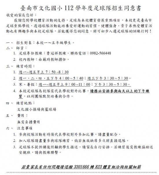 (4)本校足球隊為校隊需代表學校對外比賽,請務必安排參與兩天以上的下午練習,以利團隊默契培養與合作。