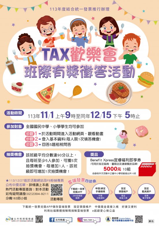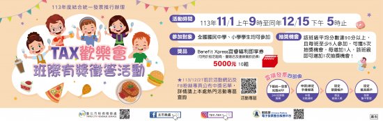 轉國中小生於 113/12/15 週三 17 時止的臺北市稅捐稽徵處舉辦「TAX 歡樂會班際有獎徵答活動」…