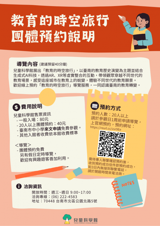 兒童科學館提供團體預約參觀、導覽服務,歡迎臺南市各中小學多加利用,線上預約「教育的時空旅行」戶外教育參訪行程,帶領學童一同認識臺南的教育轉變。