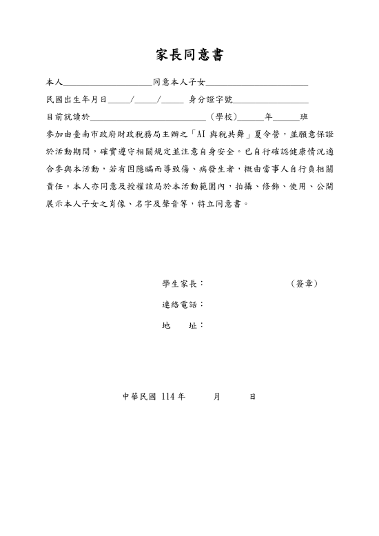 家長同意書:https://drive.google.com/file/d/1711f4qhZamQW6pDV0wOPs-Ys7nnRhJr8/view