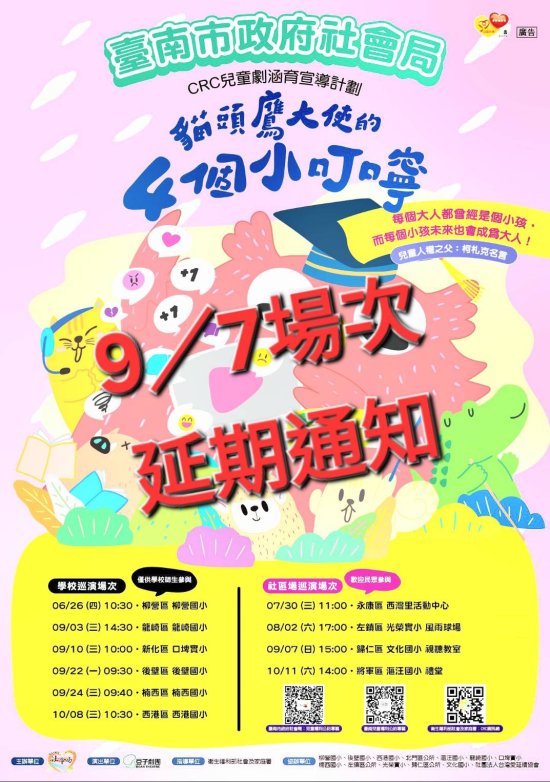 原定 9/7 (日) 下午 15:00 於本校舉辦之 CRC 兒童劇涵育宣導巡演,因主要演員生病住院,表演暫停,若有後續演出時間屆時再行公告。