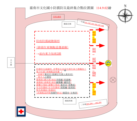 師長引導疏散至操場【集合地點在空曠場所,不需再用物品護頭】,並完成人員清查(使用紅表綠表)及安全回報動作→