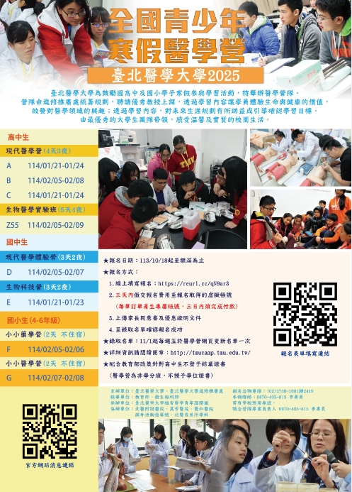 二、營隊資訊: 2025 寒假醫學營擬訂於民國 114 年 1 月 21 日至 2 月 9 日辦理。網址 http://tmucamp.tmu.edu.tw/