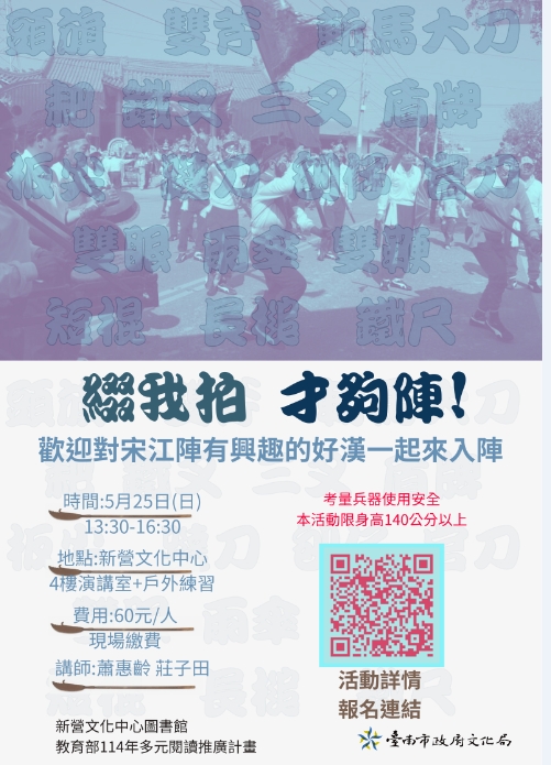 一、為推廣本市列冊追蹤之傳統表演藝術,邀請後壁長短樹拍面宋江陣成員擔任講師,並進行基礎陣法指導,歡迎國小高年級至高中學生踴躍參與。