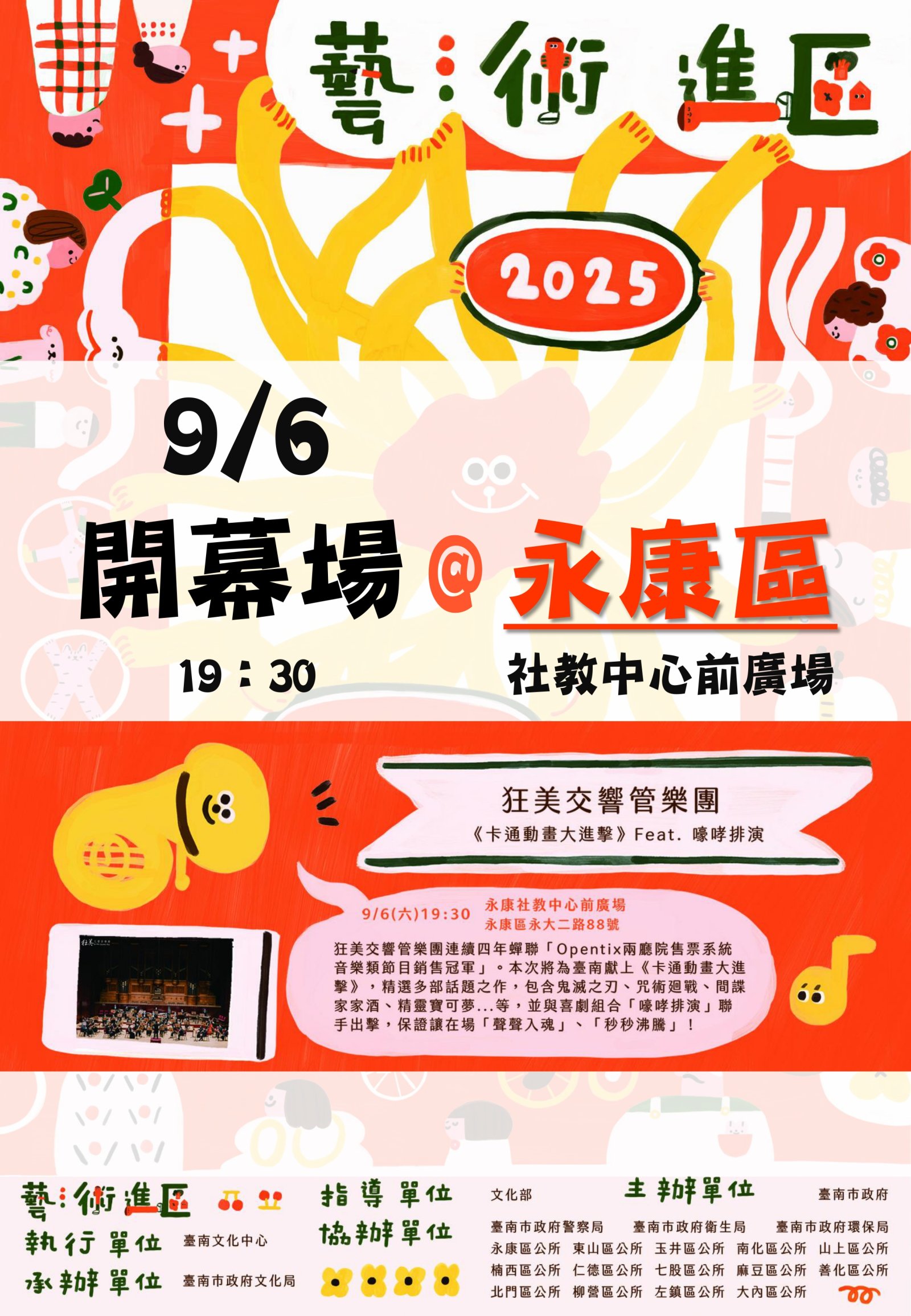 二、活動之演出單位「狂美交響管樂團」,連續四年蟬聯「Opentix 兩廳院售票系統音樂類節目銷售冠軍」,本次將為臺南獻上《卡通動畫大進擊》,精選多部話題之作,包含鬼滅之刃、咒術迴戰、間諜家家酒、精靈寶可夢等,並與喜劇組合「嚎哮排演」聯手出擊,精彩可期。