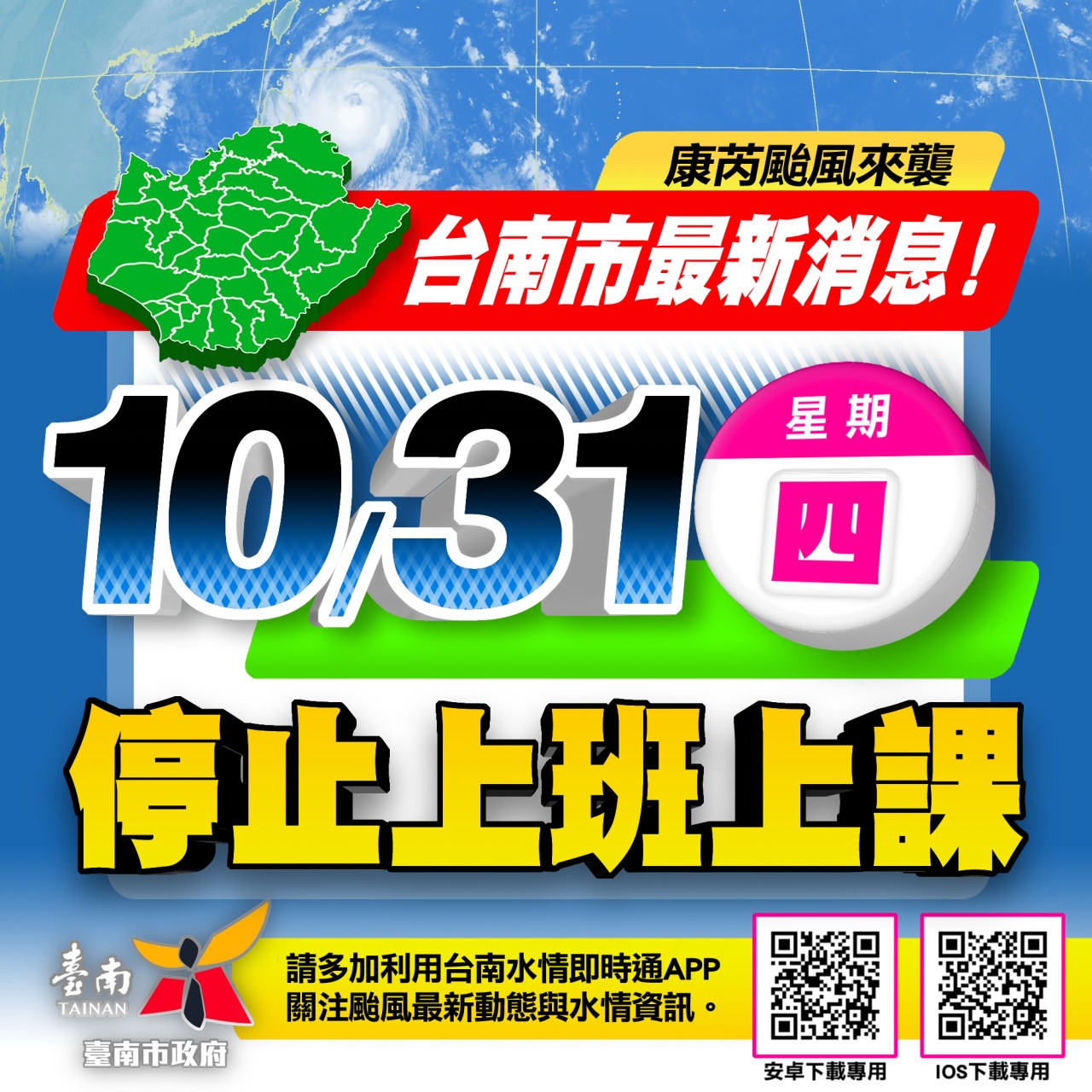 臺南市政府 10/30 晚間 8 點宣布,明日(10/31)停止上班、停止上課。呼籲市民朋友避免外出,並做好防颱準備。