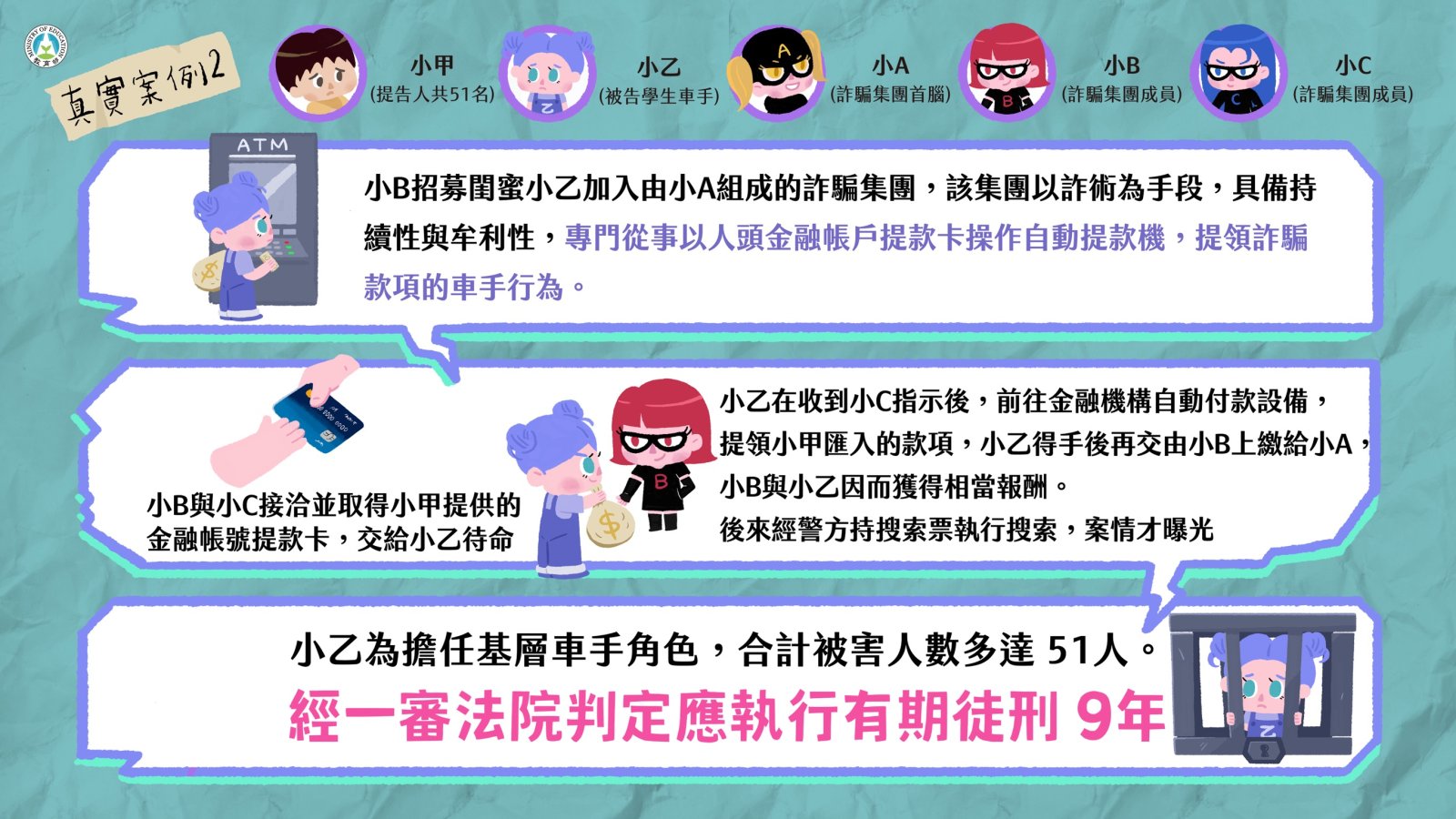 二、近年來學生擔任車手涉詐欺案件數攀升,尤以 12 至 23 歲涉案最多,教育部藉由真實案例,解析學生擔任詐騙車手所可能承擔之法律責任,製作「詐騙車手下場超慘,千萬不要以身試法!」宣導懶人包(如附件),避免學生遭不法分子利用,衍生後續的法律風險與責任。