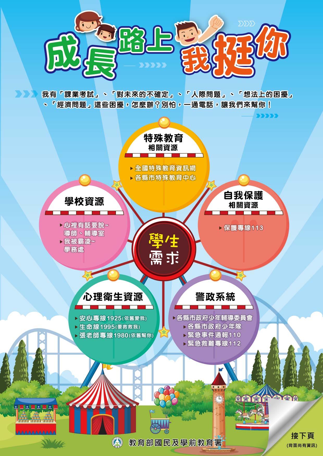 三、本宣導單透過老師知悉資源管道後,瞭解學生及家長需求,利用課程、活動或班親會說明單張之相關資訊,學校亦可製作成海報張貼以提供親職相關訊息。