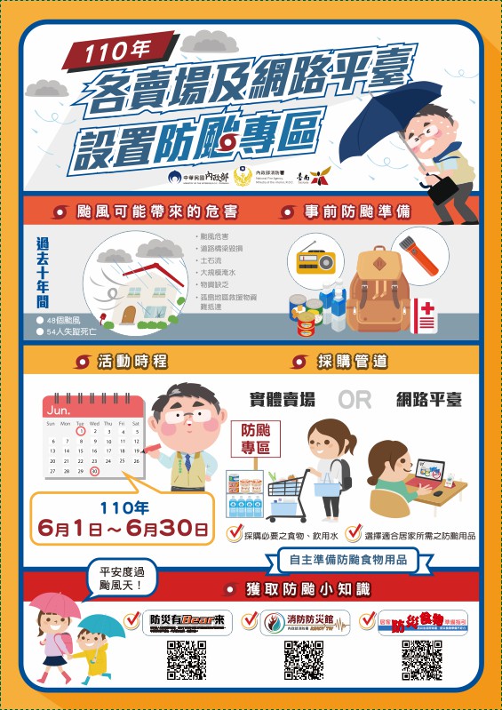 二、每年颱風季前及國家防災日時,藉由實體賣場及網路平臺設置「防颱專區」或「防災專區」,加強民眾落實防災各項準備,落實自主防災準備。