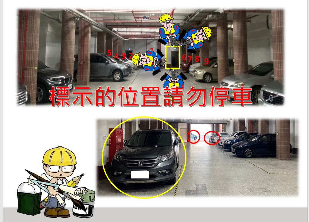2. 本周四上午起至 9/21 日止,行政大樓地下室停車場最裡面九格、外面三個位置不開放停車(請見附件圖示,中間通道也請保持暢通,切勿並排停車)。
