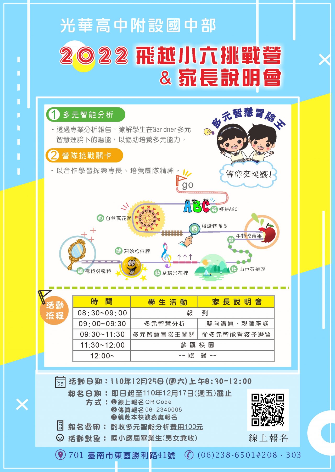 一、讓六年級學生挑戰了解自己的發展和潛力,認識了解國中課程與生活。 二、活動內容:(1)多元智能檢測(透過專業檢測報告,瞭解學生多元智慧以培養其專長)。(2)多元智慧冒險王(結合國. 英.數.社會.自然.美術以趣味闖關進行挑戰) 三、家長說明會:如何適性開展孩子的潛質,歡迎家長偕同參加。 四、報名方式及費用,請詳見活動簡章。