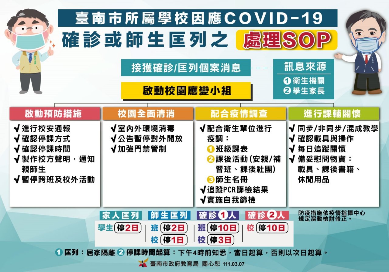 一、依據教育部 111 年 3 月 3 日臺教授國字第 1110028334 號函辦理。 二、有關中央流行疫情指揮中心(以下稱指揮中心)111 年 2 月 24 日新聞稿宣布自 111 年 3 月 7 日起調整居家隔離天數等相關防疫措施,爰修正「確診者為校(園)內人員時之處置」等部分相關規定,並自 111 年 3 月 7 日起適用。 三、另依交通部觀光局 111 年 1 月 14 日函文所示,該局已於 110 年 11 月 2 日調整防疫管理措施,並未再就住宿房型及人數加以規定;爰修正旨揭指引有關戶外教學活動之旅行業承攬防疫依據。 四、檢附本局修正後因應疑似或確診個案緊急應變流程圖卡 1 份供參,請學校持續依據指揮中心發布最新防疫等級及相關措施辦理。 五、旨揭防疫管理指引(含修正對照表)請至臺南市政府公務入口網-公文附件下載區下載(識別碼 6138)。