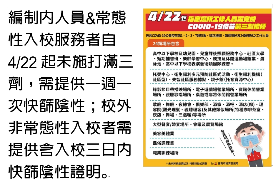 公告本校入校人員須知: 1.編制內人員以及常態性入校服務者(如志工、接送學生之安親班人員、課後社團教師、各團隊老師…等),自 4/22 起未施打滿三劑,需提供一週一次快篩陰性。 2.校外人員非常態性入校者(如:洽公人員、入校維修人員、書商…等),自 4/22 起未施打滿三劑需提供含入校三日內快篩陰性證明。 3.以上人員入校,請於大門口出示以下證明文件始可入校。 與本校警衛或防疫導護確認: (1)施打三劑完畢證明(黃卡或健保快易通)+掃 QRcode (2)未打滿三劑者,請出示快篩陰性證明+掃 QRcode