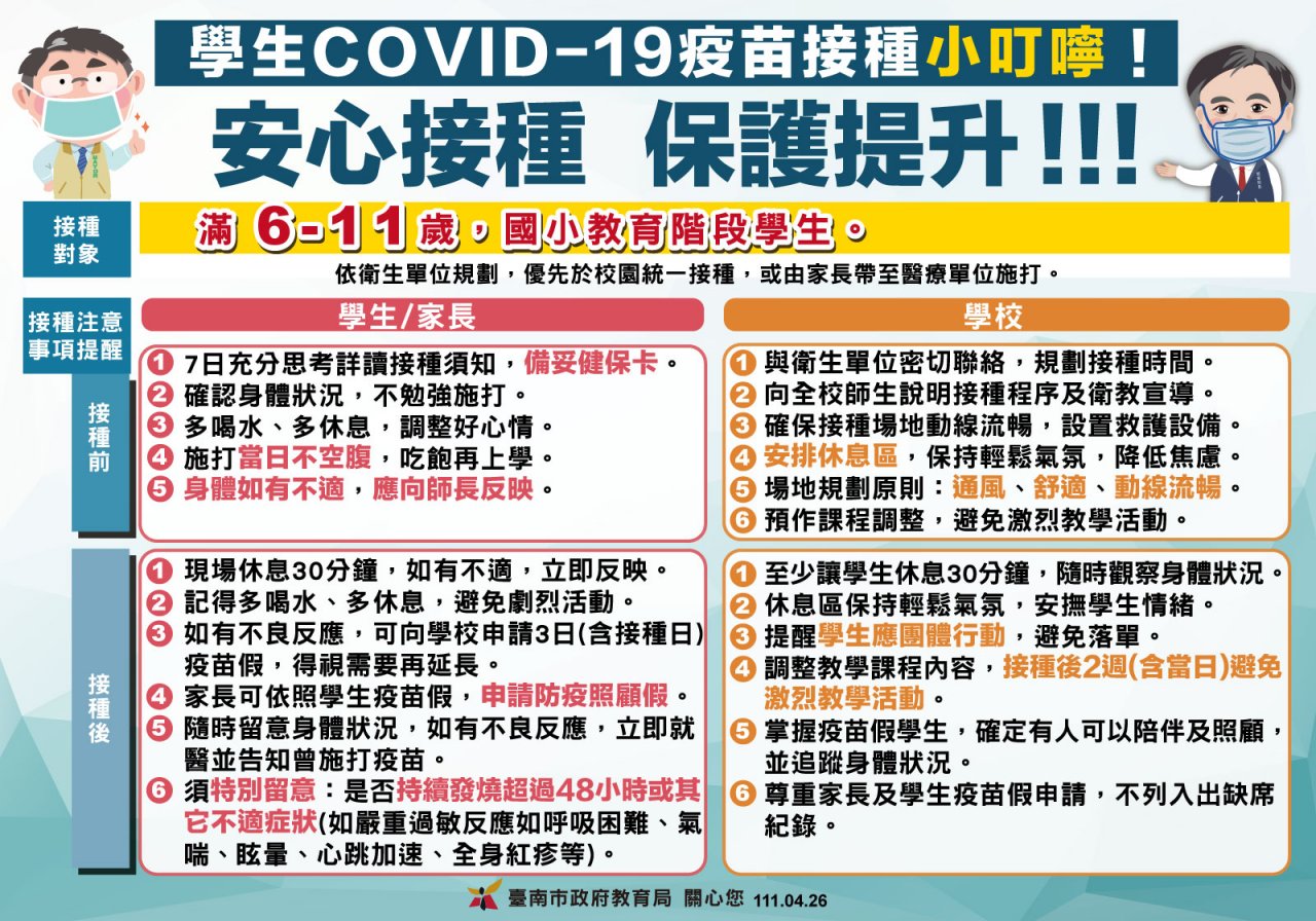 因作業時效問題,依臺南市政府教育局 111 年 4 月 26 日南市教安(二)字第 1110556312 號函提及需給予家長至少 7 天的充分思考時間,以利其瞭解國際間青少年接種 mRNA 疫苗之副作用監測情形及接種疫苗之效益,評估並決定是否讓子女接種,故先提供家長莫德納疫苗 6 至 17 歲接種評估暨意願書及 6 至 17 歲接種須知電子檔點閱,紙本將於近日發放。