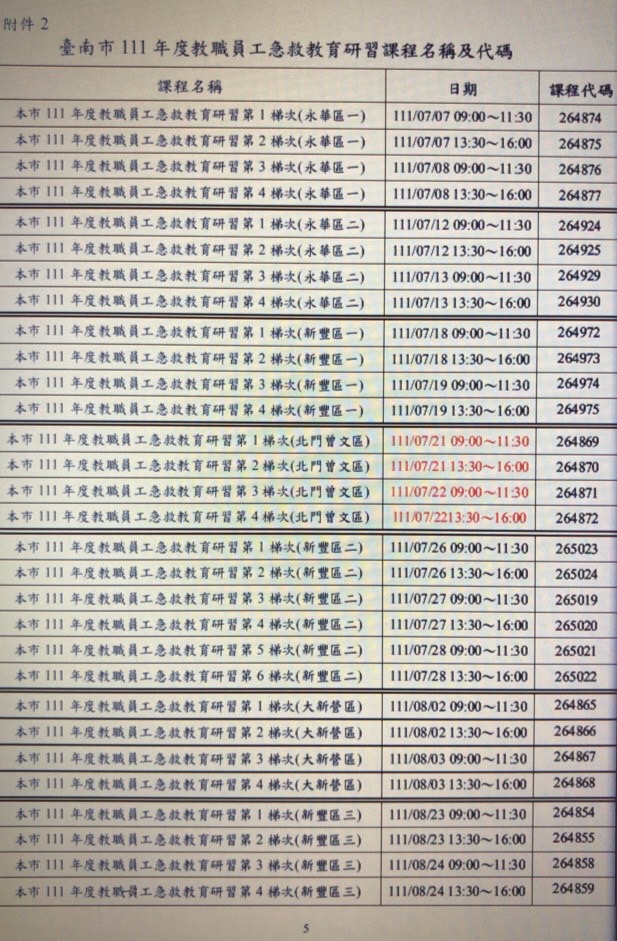 三、檢送臺南市 111 年度教職員工急救教育研習實施計畫。