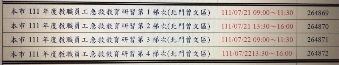 1 、線上課程:請學員自 111 年 5 月 2 日起逕至本局愛課網修讀「急救教育推廣課程-教職員工 CPR 訓練課程」並通過測驗。(網址: https://icourse.tn.edu.tw/mooc/index.php)