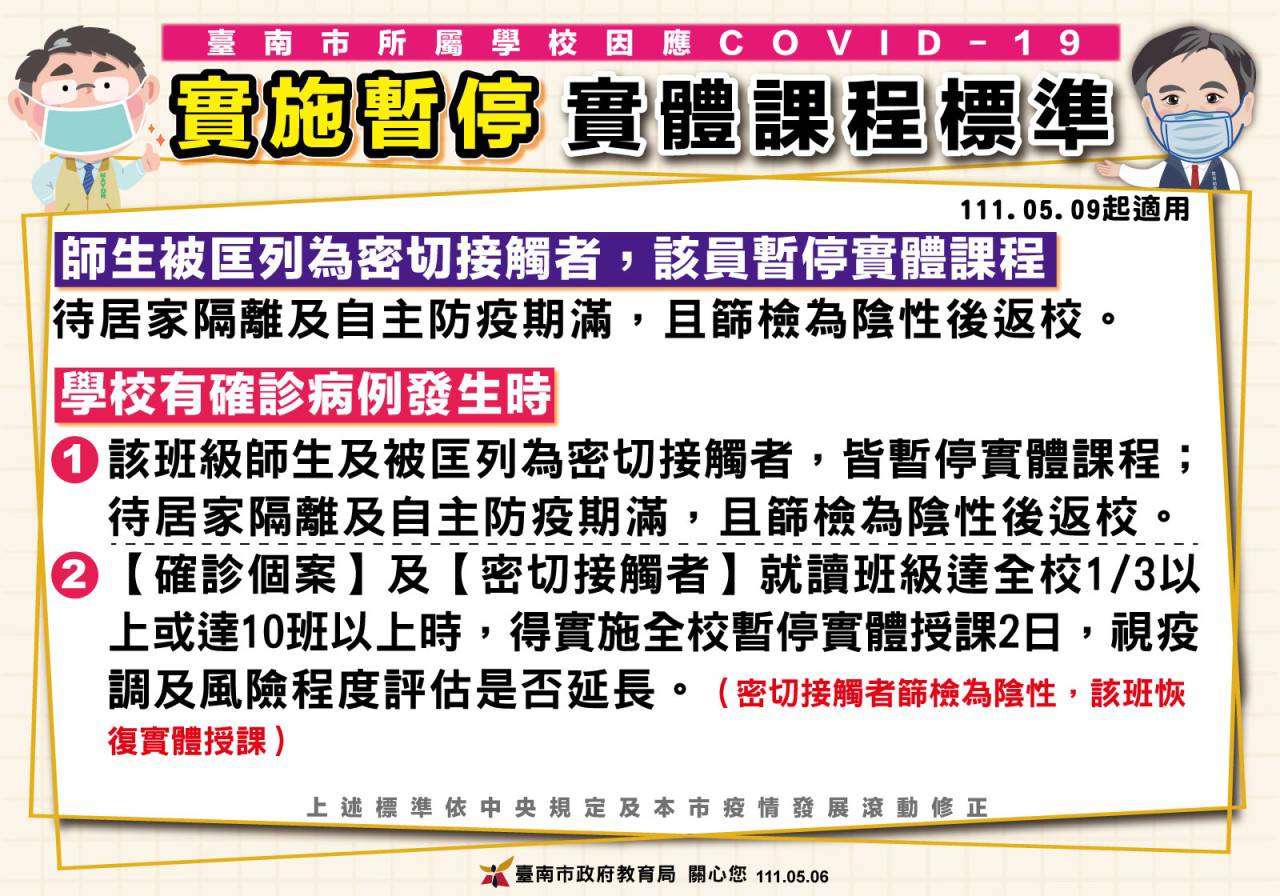 公告本市實施暫停實體授課標準 1110506 版。