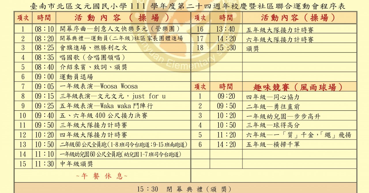1.公告本校校慶運動會「活動程序表」,請親師生依活動程序表進行活動。