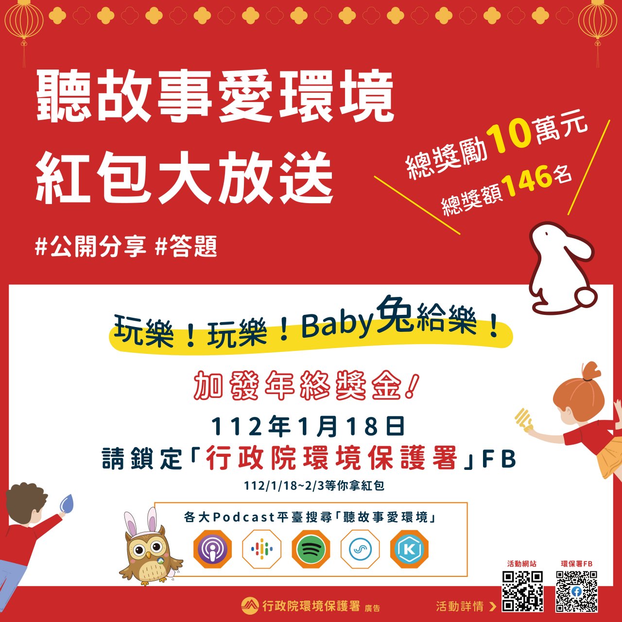 三、為增進「聽故事愛環境」節目效益,遂於農曆新年期間辦理旨揭活動,本活動期間為 112 年 1 月 18 日(星期三)至 2 月 3 日(星期五),民眾只要至「行政院環境保護署」臉書粉絲專頁完成指定「任務題」或「知識題」,即可有機會抽中超商禮券或環保綠點,總獎額 146 名,總獎值高達新臺幣 10 萬元。
