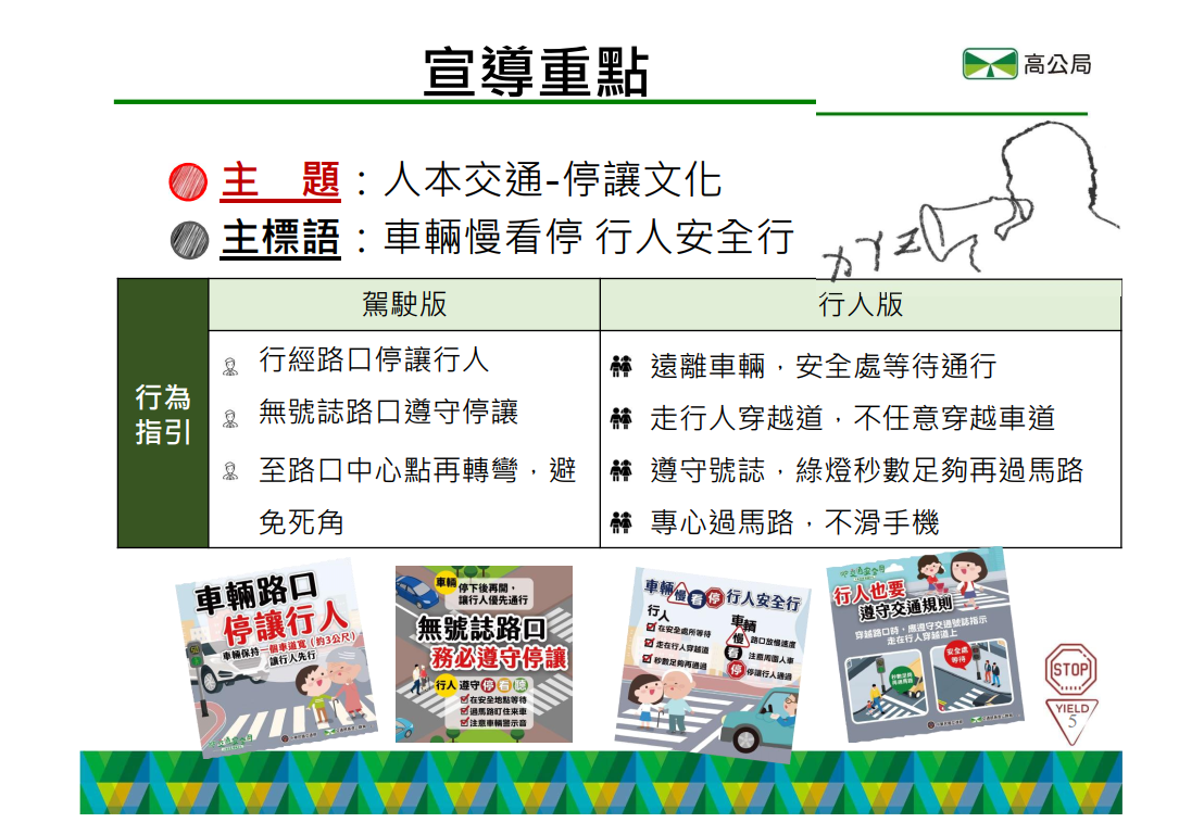 二、今年活動主題為「車輛慢看停,行人安全行」,以各式宣傳管道播放旨揭影片及歌曲,以喚起交通安全觀念之重視。