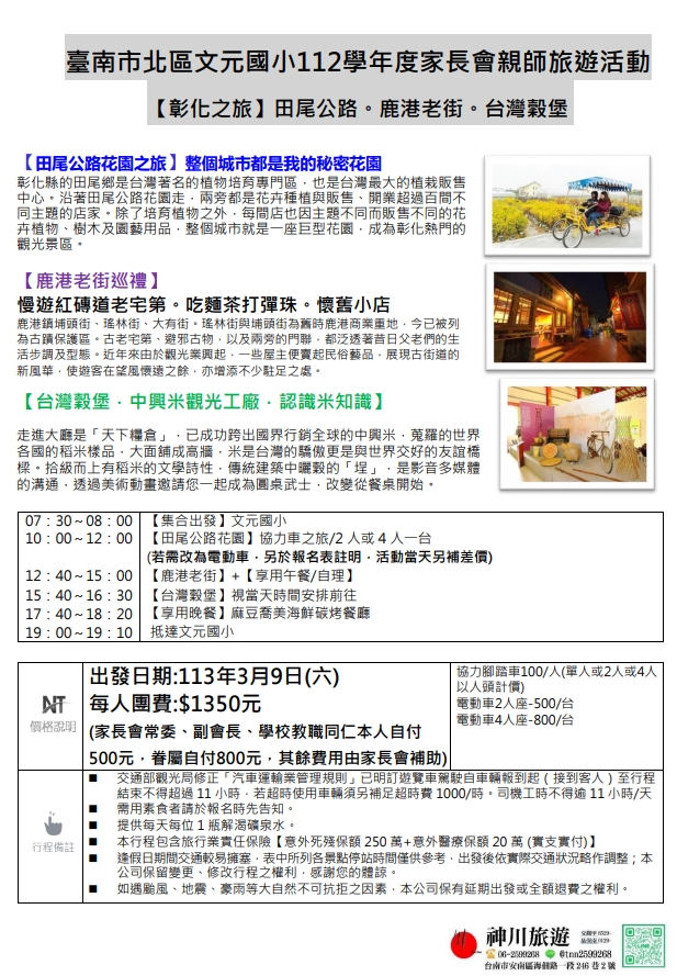二、行程規劃: 如附件檔 三、每人團費:$1350元(含車資、保險、協力車、晚餐)家長會常委、副會長、學校教職員工本人自付500元,眷屬自付800元,其餘費用由家長會補助