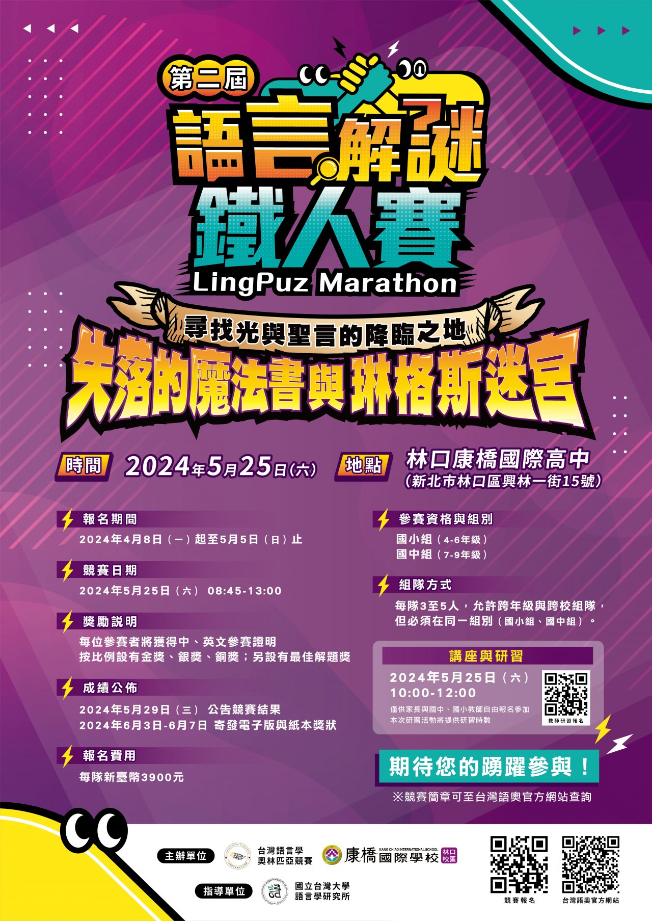 三、此次活動亦辦理教師研習,時間為 113 年 5 月 25 日 10 時至 12 時。歡迎國中、小教師報名參加。(報名網址: https://reurl.cc/j3N2M1