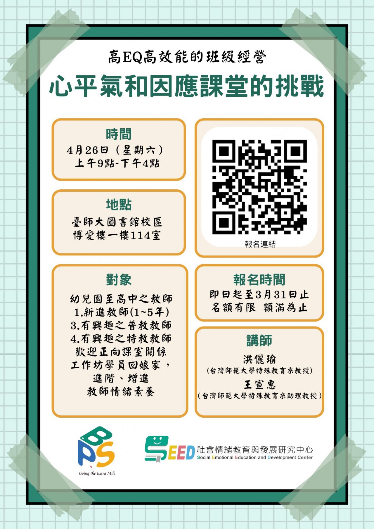 三、「高 EQ 高效能的班級經營:心平氣和因應課堂的挑戰」報名期程及辦理方式說明如下: