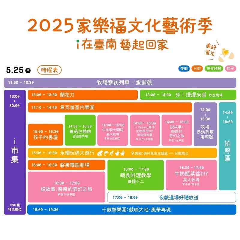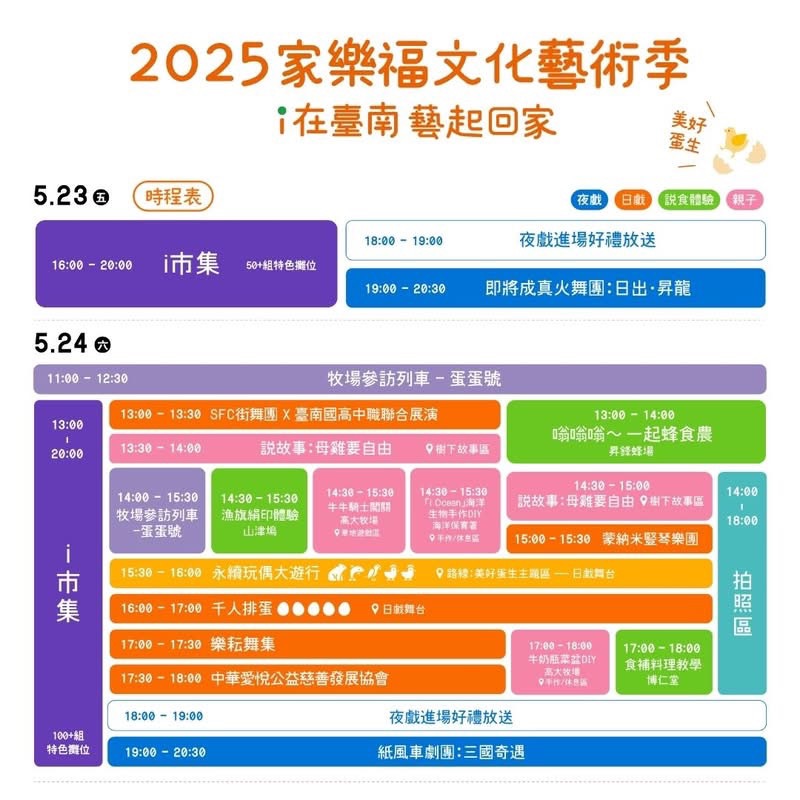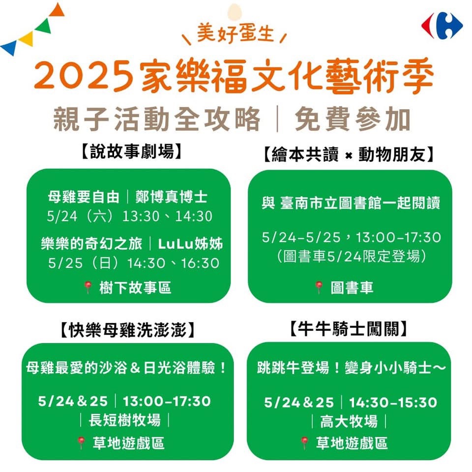 臺南市政府文化局與財團法人家樂福文教基金會將於 114 年 5 月 23 日(五)至 5 月 25 日(日)於臺南市立新營體育園區舉辦 2025 家樂福文化藝術季,有日戲、夜戲演出與市集,全程免費入場,邀請共襄盛舉。「2025 家樂福文化藝術季」於本市新營體育場隆重登場,活動相關訊息如下: