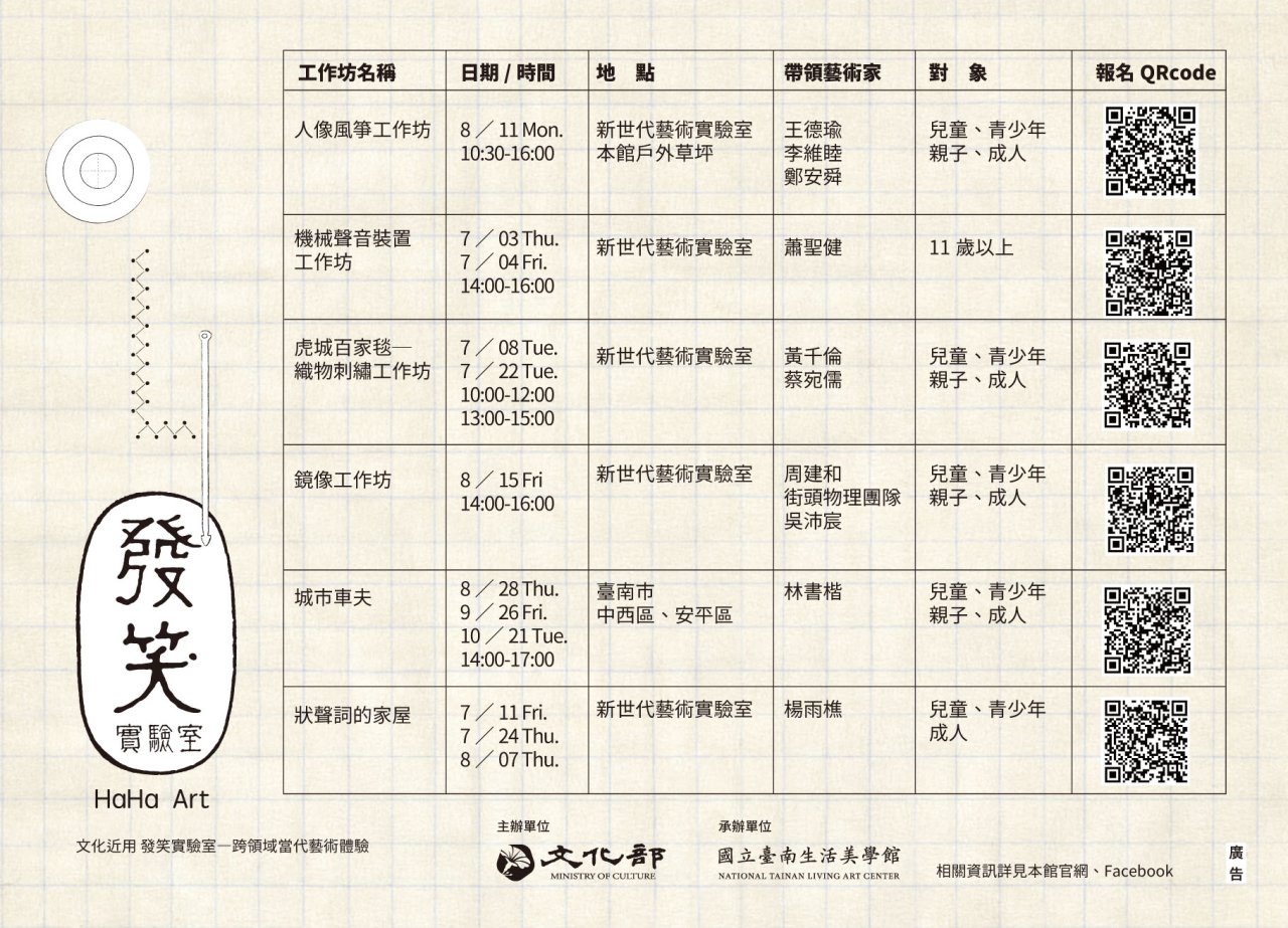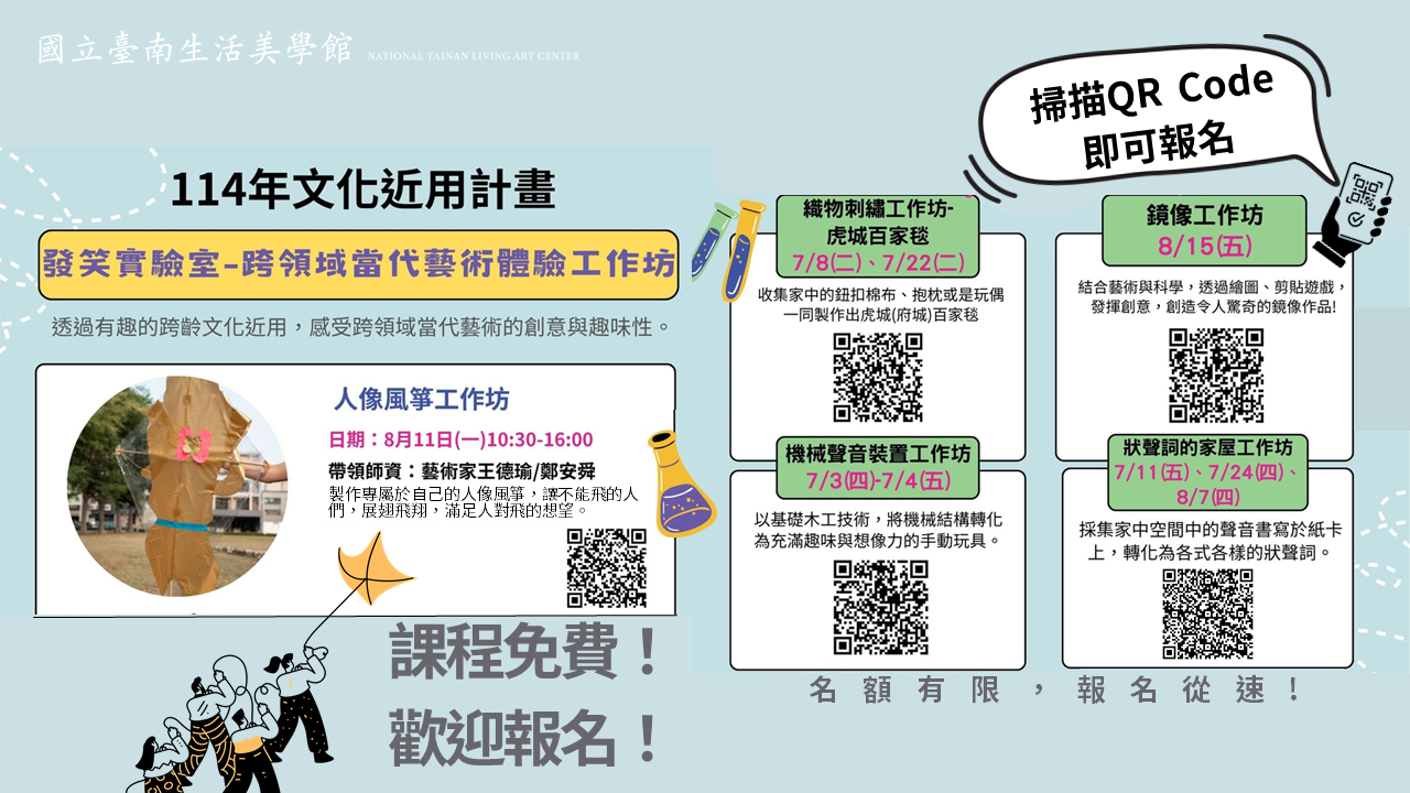 二、歡迎共同創作「機械手動玩具」、「人像風箏」、「虎城(府城)百家毯」、「科學鏡像繪圖遊戲」、「狀聲詞的家屋」,感受跨領域藝術與嬉遊間的創造性連結,相關活動均為免費,即日起受理報名,資訊說明如下: