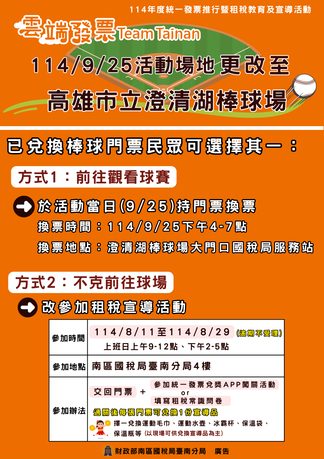 一、因臺南市立棒球場受到颱風影響受損, 114 年 9 月 25 日棒球賽事場地調整至澄清湖棒球場,已捐贈發票兌換當日臺南球場門票之民眾,可就下列二種方式選擇其一參與活動:
