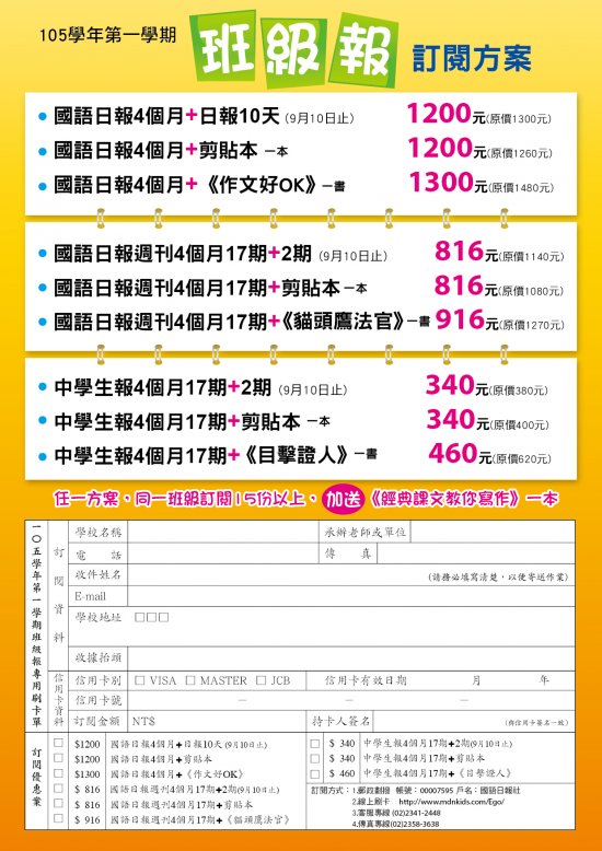 明: 一、 105 學年即將於 8 月 29 日開學,本社即日起推出「105-1 學期班級報」優惠訂閱專案,此案訂閱期間以 105 學年第一學期為訂閱時程(105.9.1~105.12.31)。