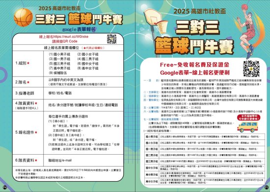 二、比賽組別及招收隊數:國小男子組 84 隊、國小女子組 24 隊、國一男子組 60 隊、國二男子組 60 隊、國三男子組 60 隊、國中女子組 24 隊、高中男子組 72 隊、高中女子組 24 隊,共計 8 組,總隊數預計 408 隊,是全國青少年三對三籃球賽大型賽事之一。