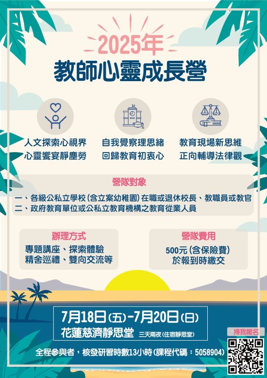 (一)活動時間: 114 年 7 月 18 日(星期五)至 7 月 20 日(星期日),三天兩夜,住宿靜思堂。
