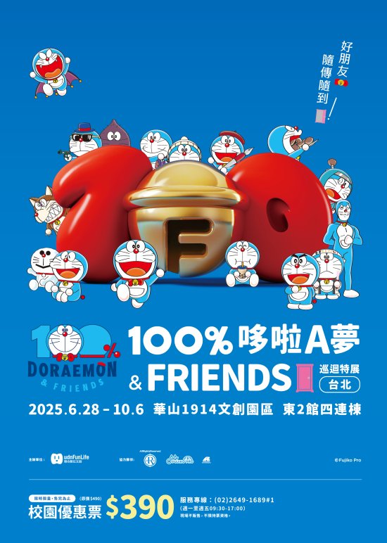 一、《 100%哆啦 A 夢&FRIENDS 》全球巡迴展今夏登台!深受大小朋友喜愛的哆啦 A 夢與他的好友們再次齊聚於台北,這次更帶著特別祕密道具─「100%朋友召喚鈴」,邀請各位朋友們一同玩樂,現場將展出眾多造型立體雕塑、複製原畫手稿以及多種沉浸式場景,還將重現藤子・F・不二雄老師的工作室,以及各種充滿無限想像力的神奇道具,帶領大家與哆啦 A 夢共同來創造許多美好回憶。