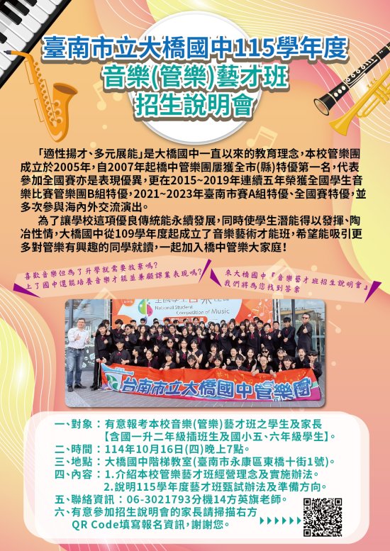 一、對象:有意報考大橋國中 音樂(管樂)藝才班之學生及家長