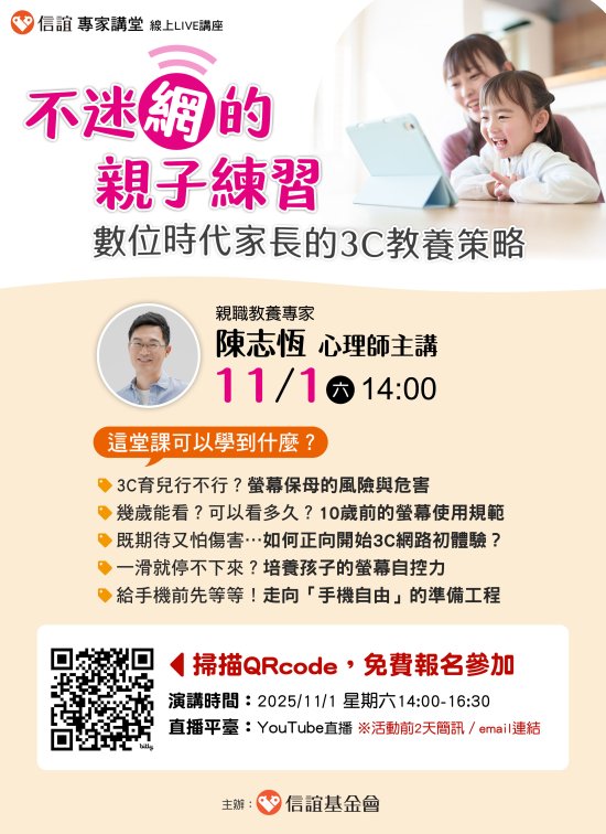 一、面對數位裝置普及、 AI 浪潮來襲,教養挑戰正不斷升級。唯有從「家」出發,啟動正向 3C 教養策略,才能讓數位工具成為孩子成長的助力,而非阻力。信誼將於 2025 年 11 月 1 日(六)下午 2 : 00-4 : 30 舉辦【不迷「網」的親子練習:數位時代家長的 3C 教養策略】線上 LIVE 講座,邀請家長免費報名參加。