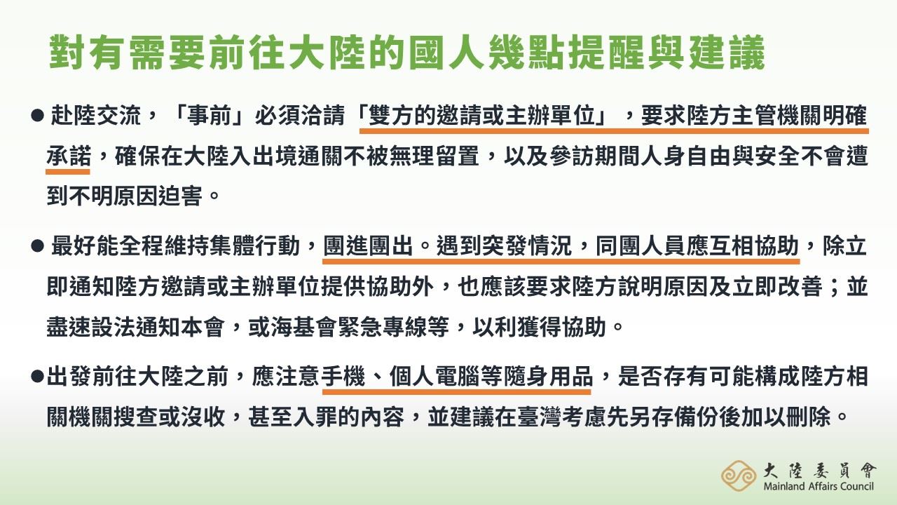陸委會官網「國人赴陸港澳登錄系統及赴陸港澳易遭押行為態樣」專區,已有建置「國人赴陸港澳動態登錄系統」、「容易觸犯中共國安罪嫌之行為態樣」、「國人赴陸風險實際案例」、「赴陸提醒與建議事項」及「旅遊警示」等相關資訊。