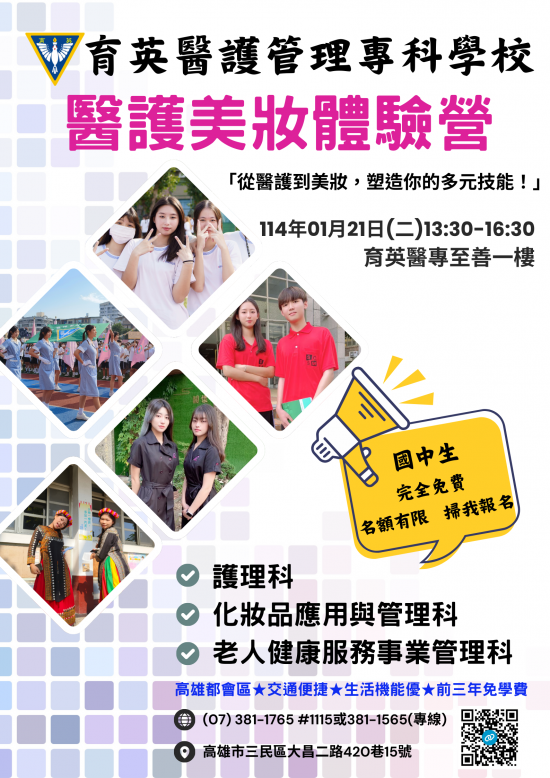 四、體驗科系:護理科、老人健康服務事業管理科、化妝品應用與管理科。