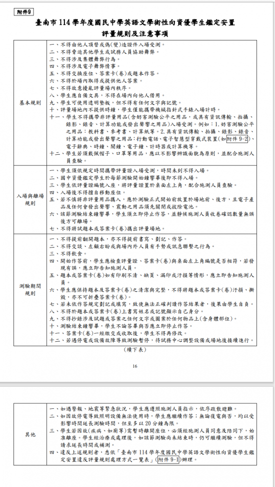 2. 臺南市114學年度國民中學英語文學術性向資優學生鑑定安置【初選】應試注意事項如附件,請參閱