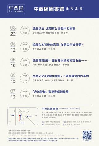 一、為鼓勵更多青少年走進圖書館,本區圖與台南社區大學合 作規劃「中西區遊戲講堂」系列講座,從遊戲文本創作的 角度出發,探討遊戲的社會意涵,並結合臺南在地的遊戲 化案例,帶領青少年族群深入了解遊戲作為藝術與文化載 體的多重面向。