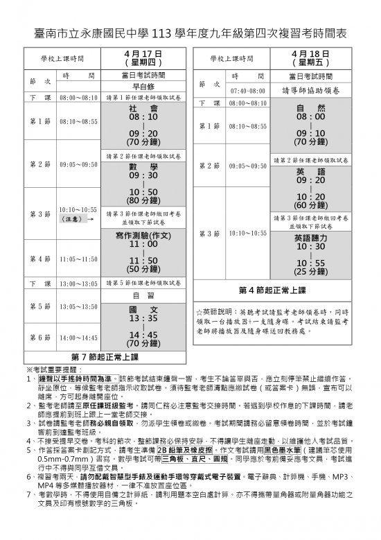 一、三年級第四次複習考時間為 4/17(四)~4/18(五)。相關考試時間表如附件,請三年級學生利用時間溫書。