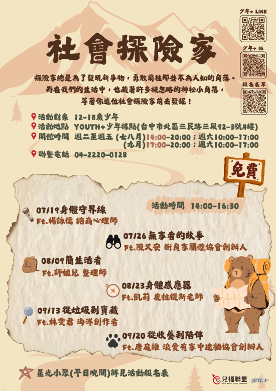 二、本季規劃「社會探險家」社會共好主題活動,期待透相關課程讓孩子有機會認識與看見社會其他面貌,從中了解更多社會組織與公益團體,並落實在日常生活中。課程及報名資訊詳見活動 DM 。