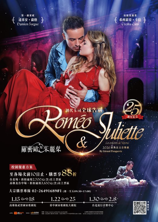 一、經典法文音樂劇《羅密歐與茱麗葉》自 2001 年在巴黎首演即轟動全球,以磅礴動人的音樂、現代感十足的編舞與都市巴洛克風格美學,重新詮釋莎士比亞經典悲劇,劇中更以紅與藍兩大色系象徵家族對峙,展現強烈視覺張力;而初代卡司的演出早已成為大眾心中難以取代的記憶,本次適逢音樂劇 25 周年同時也是初代卡司告別巡演,讓這次在台灣的演出更具紀念性。法文音樂劇以獨樹一格的「演唱會」形式製作打造,特別強調「音樂」與「演員魅力」,以「歌」帶「戲」是法式音樂劇製作的順序與模式,藉由歌曲詠唱以及雋永詞彙的表達,再加上多樣化背景音樂襯托,讓演員的情緒起伏及情感傳遞更加深刻。誠摯推薦師生前來觀賞國際級精彩演出,並藉此增進對各類表演類型的了解。
