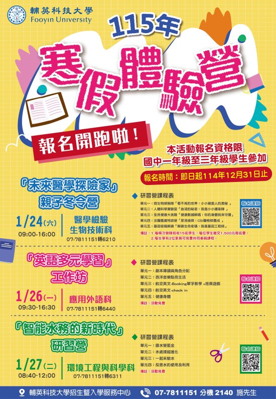 (六)報名方式:請掃描海報上各營隊QR CODE或至輔英科技大 學首頁/招生資訊網/研習營(https://recruit.fy.edu tw/p/412-1087-13065.php?Lang=zh-tw),點選連結報 名