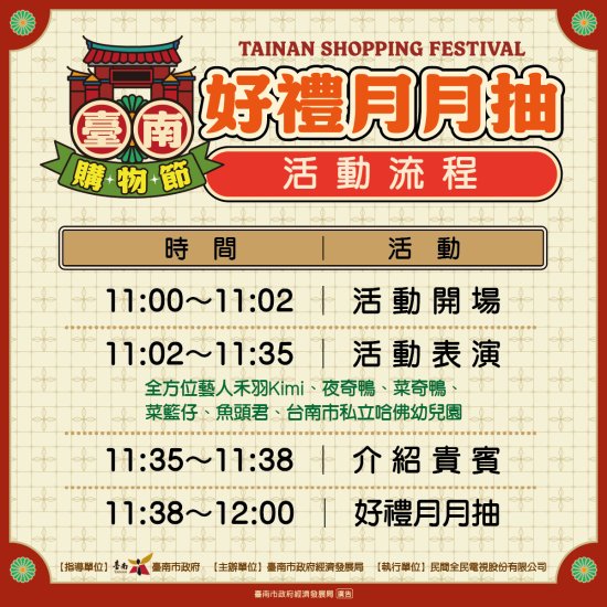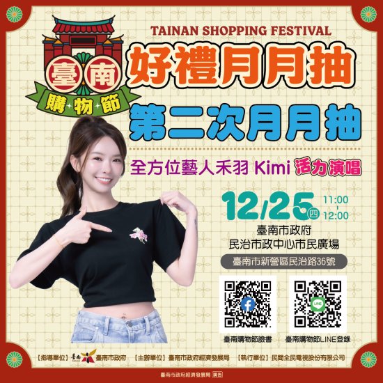 一、為活絡本市消費、帶動城市經濟發展,本局辦理「2025 臺南購物節」,並訂於 114 年 12 月 25 日(星期四)舉辦第二場「好禮月月抽」公開抽獎活動,活動內容豐富、免費入場,適合親子共同參與。