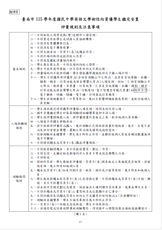 2. 臺南市115學年度國民中學英語文學術性向資優學生鑑定安置【初選】應試注意事項如附件,請參閱。