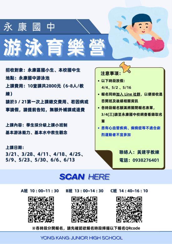 八、報名完成後,記得加入游泳 Line 班群,開課訊息及相關注意事項,將公告於永中校網或 Line 群組中。