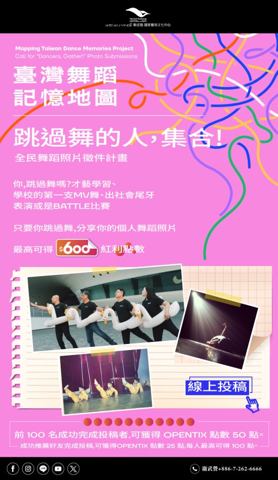 (二)「跳過舞的人,集合!」全民舞蹈照片徵件活動參考簡章(附件二)或衛武營官網網址: https://npacwwy.tw/en08gMrIj ,邀請師生共同參與投稿,擴大舞蹈記憶之蒐集與交流。