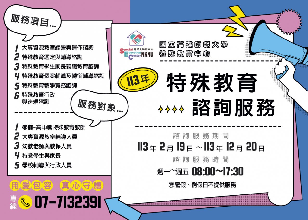 二、本校特殊教育中心所提供之電話諮詢服務專線為: 07-7132391 ;網路諮詢服務網址為: https://special.moe.gov.tw/consultation.php?paid=58 。