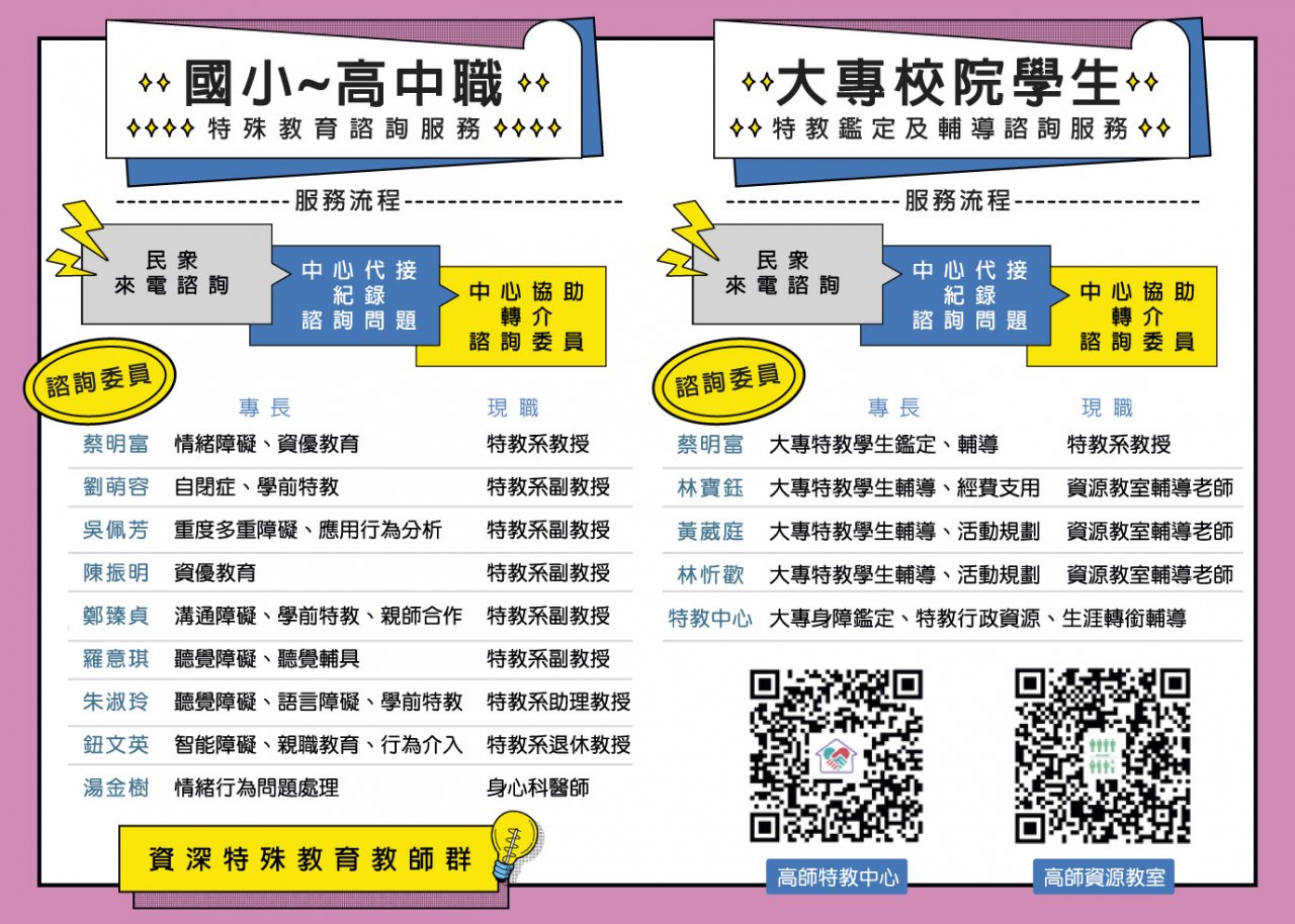 一、本校特殊教育中心接受教育部委託辦理「特殊教育諮詢專線」,以提供各級學校師生及家長特殊教育諮詢服務。